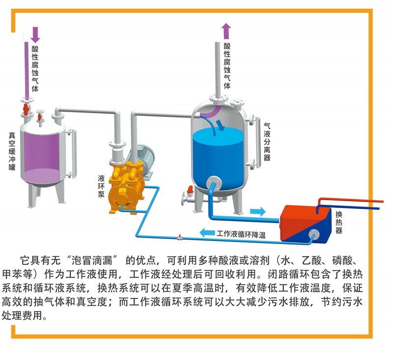耐腐蝕液環泵可以升級為閉路循環系統,它由FSK系列、F2SK系列、F2BV系列、F2BE系列和JZJFS羅茨泵系列,與真空換緩沖罐、汽液分離器、換熱器、連接管路等串聯組成。閉路循環與用戶DCS 連接可實現自動控制。